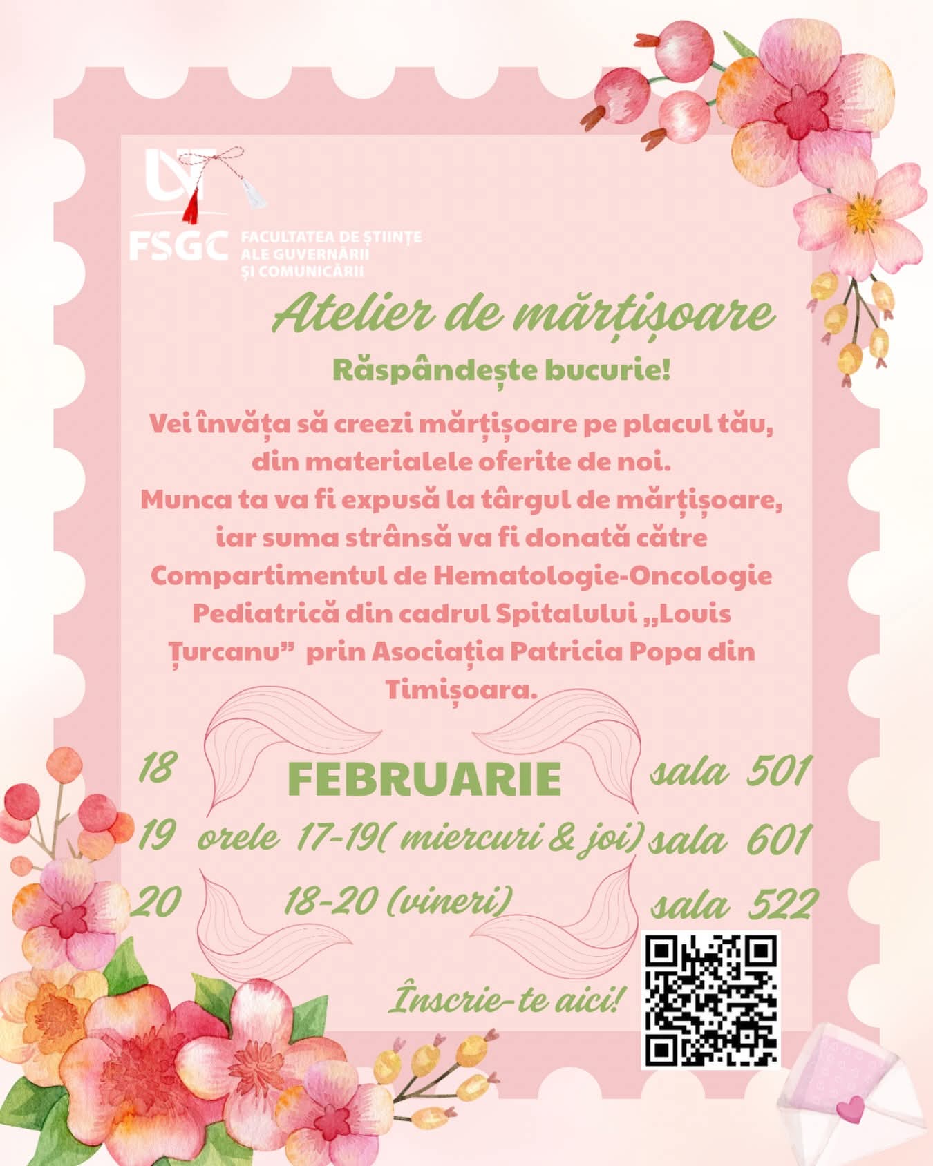 După succesul de anul trecut, când am reușit împreună să aducem un strop de speranță prin creativitate, Facultatea de Științe ale Guvernării și Comunicării vă invită la cea de-a doua ediție a atelierelor caritabile de mărțișoare!